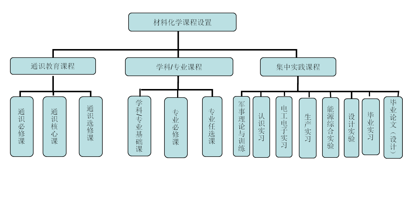 无机化学、分析化学、有机化学1、有机化学2、物理化学、基础化学实验(Ⅰ-1、Ⅰ-2、Ⅱ、Ⅲ)、化工原理、化工原理实验、新型能源材料、材料化学、材料化学实验、材料科学基础、材料现代测试技术、功能材料、材料表面改性、金属材料学等。