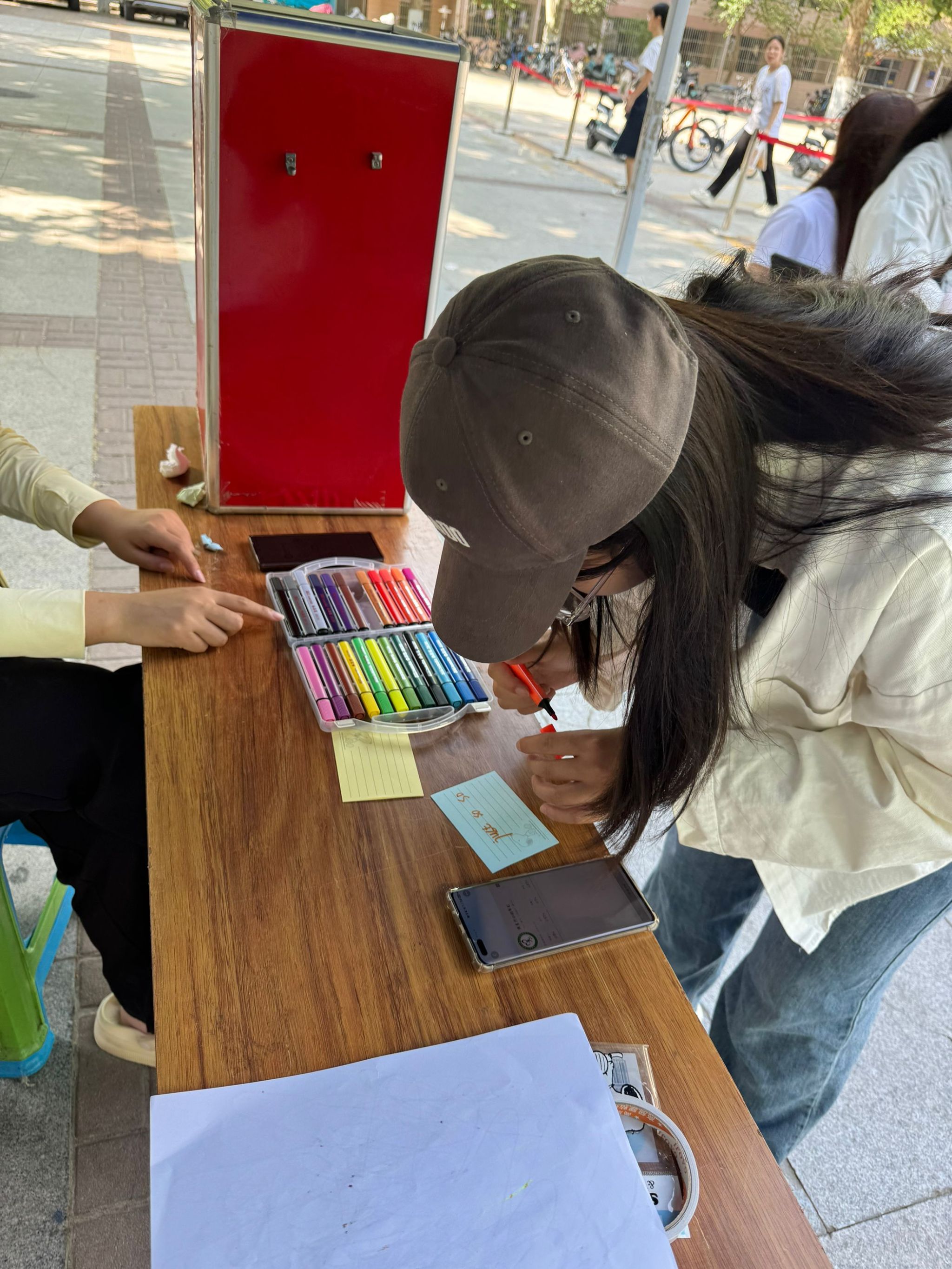 活动分为情绪表达、留言鼓励、自我激励三部分。首先,参与者领取便签,在便签上写下自己当前的焦虑、烦恼,通过自己喜欢的方式把它们投进“情绪垃圾箱”,从而达到释放压力的目的。接着参与者在领取到的卡纸上写下自己对他人鼓励的话语并折成自己想要的形状投放到“情绪鼓励箱”,为下一位参与者传递正能量。最后参与者可以在“情绪鼓励箱”中抽取一张卡片,查看他人对自己的鼓励与安慰,从而感受到来自周围人的温暖。