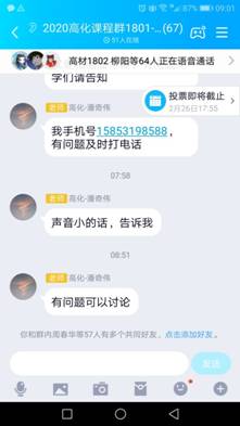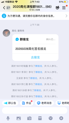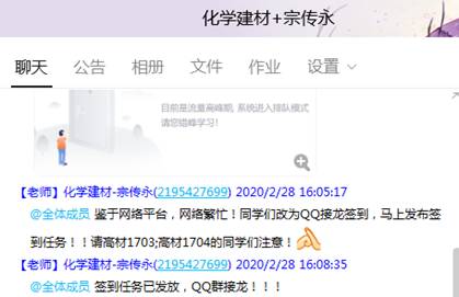 宗老师利用寒假的时间,在课程开课前在公司的网络平台建设了化学建材在线课程,课前还通过QQ文件传送了课件、辅助学习资料等,为员工提供了充分的学习资源。课前5分钟尝试学习通签到,发现网络拥堵,马上启动预案,通过QQ接龙签到,员工全部按时签到。正式开始上课后再次提醒学习的重点内容。上课过程中,以员工在线学习为主,同时通过自学照片、个别互动答疑等方式抽查员工的学习状态和效果。课后发布了课下作业,并给出了明确的作业要求和时间要求。