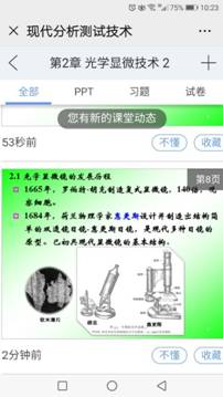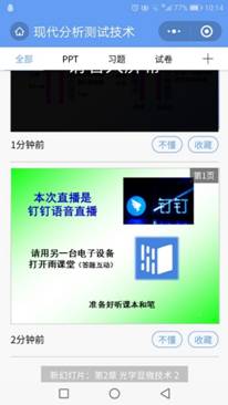 刘广宁老师的《现代分析测试技术》,采用钉钉直播和雨课堂互动相结合的授课方式,钉钉直播的优势在于播放流畅且员工课后可以看课程回放,老师还能监控到每个员工的观看时长。刘广宁老师对于课程做了多种预案,准备充分,课件图文并茂,动画演示效果好,并能够结合实际应用和科研讲解显微镜的应用,课堂气氛活跃,员工全部在线听课并有积极互动。