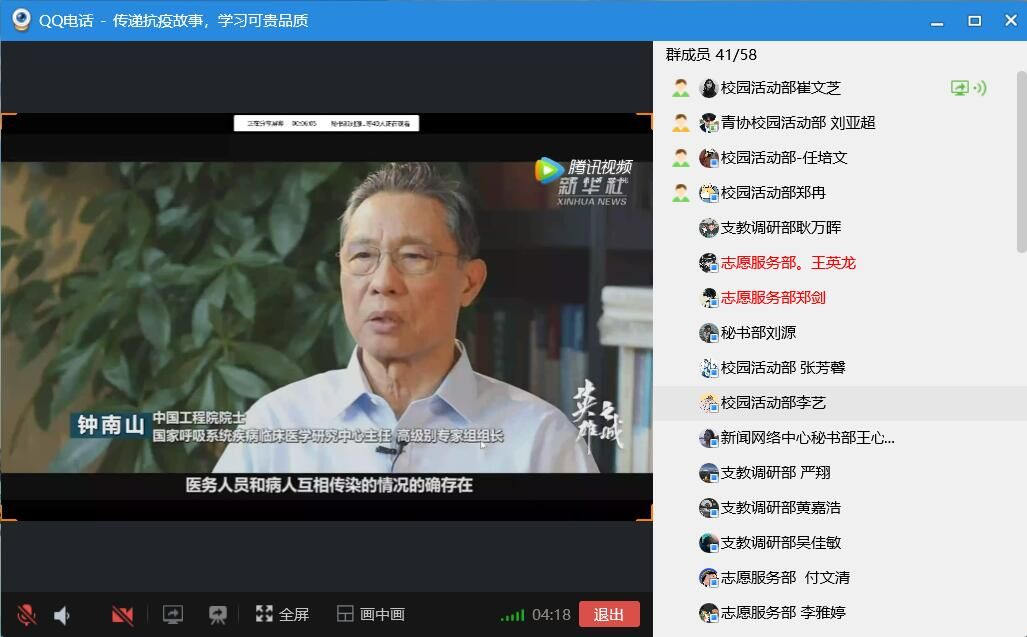 在抗击新型冠状病毒肺炎这场无声的战役之中,涌现出一大批勇毅的英雄,他们主动出击,甘当疫情防控“守门员”。为了深入了解抗疫英雄们的感人事迹,从中学习他们冲锋在前,不惧艰险的精神,beat365亚洲体育官方网站心连心爱心社于4月5日晚在线上举办了传递“抗疫故事,学习可贵品质”主题活动,心连心爱心社部分成员参加了本次活动。