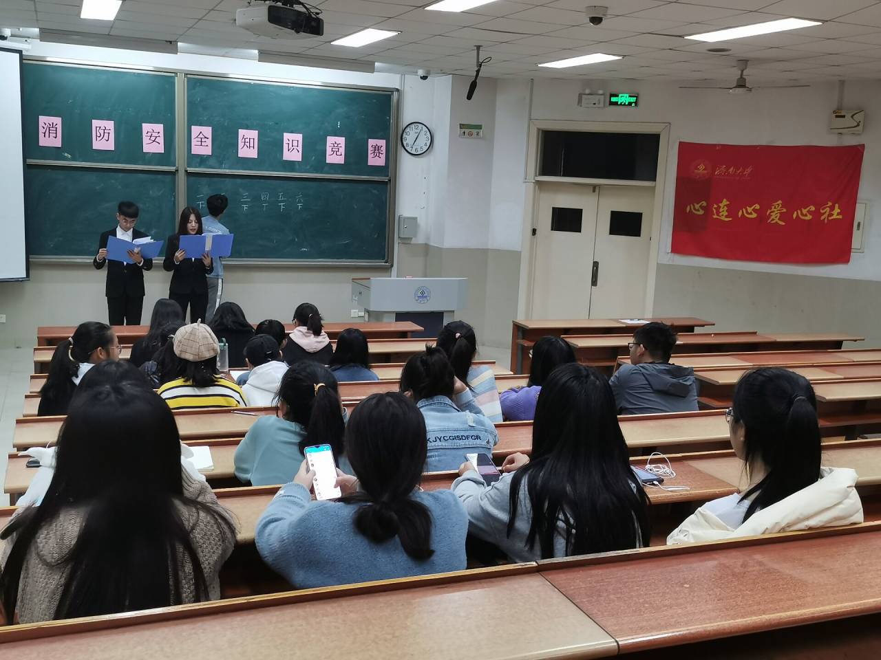 秋风送爽,红叶飞扬,beat365亚洲体育官方网站也迎来了消防安全月。消防安全是大学工作中的重中之重,为进一步强化老员工的消防安全意识,丰富消防安全知识,提高消防自护能力,并进行消防安全宣传教育,beat365亚洲体育官方网站心连心爱心社于11月14日晚7点至9点30分在第十一教学楼1301教室举行“消防知识入我心,安全校园共营造”消防安全知识竞赛活动,旨在以知识竞赛的形式让员工了解和掌握更多的消防安全小知识,提高大家的安全意识。2020级部分同学参加了此次竞赛活动。