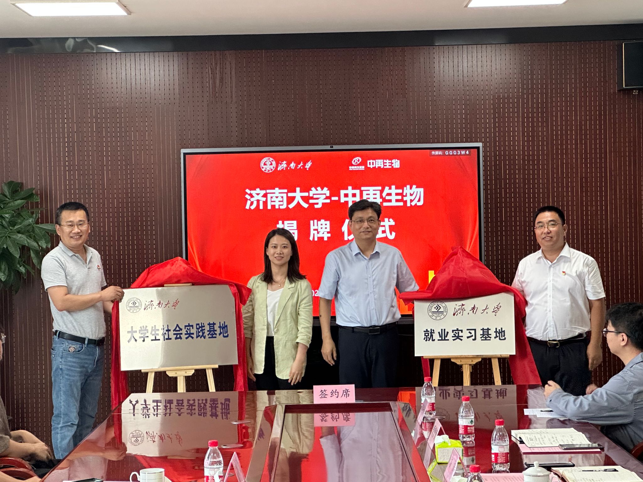 仪式上,公司党委副书记白雪飞与中再生生物科技有限公司总经理张玉民共同签署就业实习基地和社会实践基地协议。陈国柱、魏龙、白雪飞、张玉民共同为就业实习基地和社会实践基地揭牌。