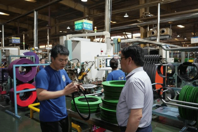 公司一行首站抵达山东华盛橡胶有限公司,技术研发中心副主任、山东宏盛科技有限公司总经理陈建军,技术研发中心部长徐凯,技术研发中心部长朱新静等热情接待。公司一行参观了企业研发中心,详细了解了公司在橡胶制品研发、新材料应用等领域的技术突破与创新成果。随后,双方深入一线生产车间,实地考察智能化生产线与精益化管理模式,直观感受产业升级对技术技能型人才的迫切需求。