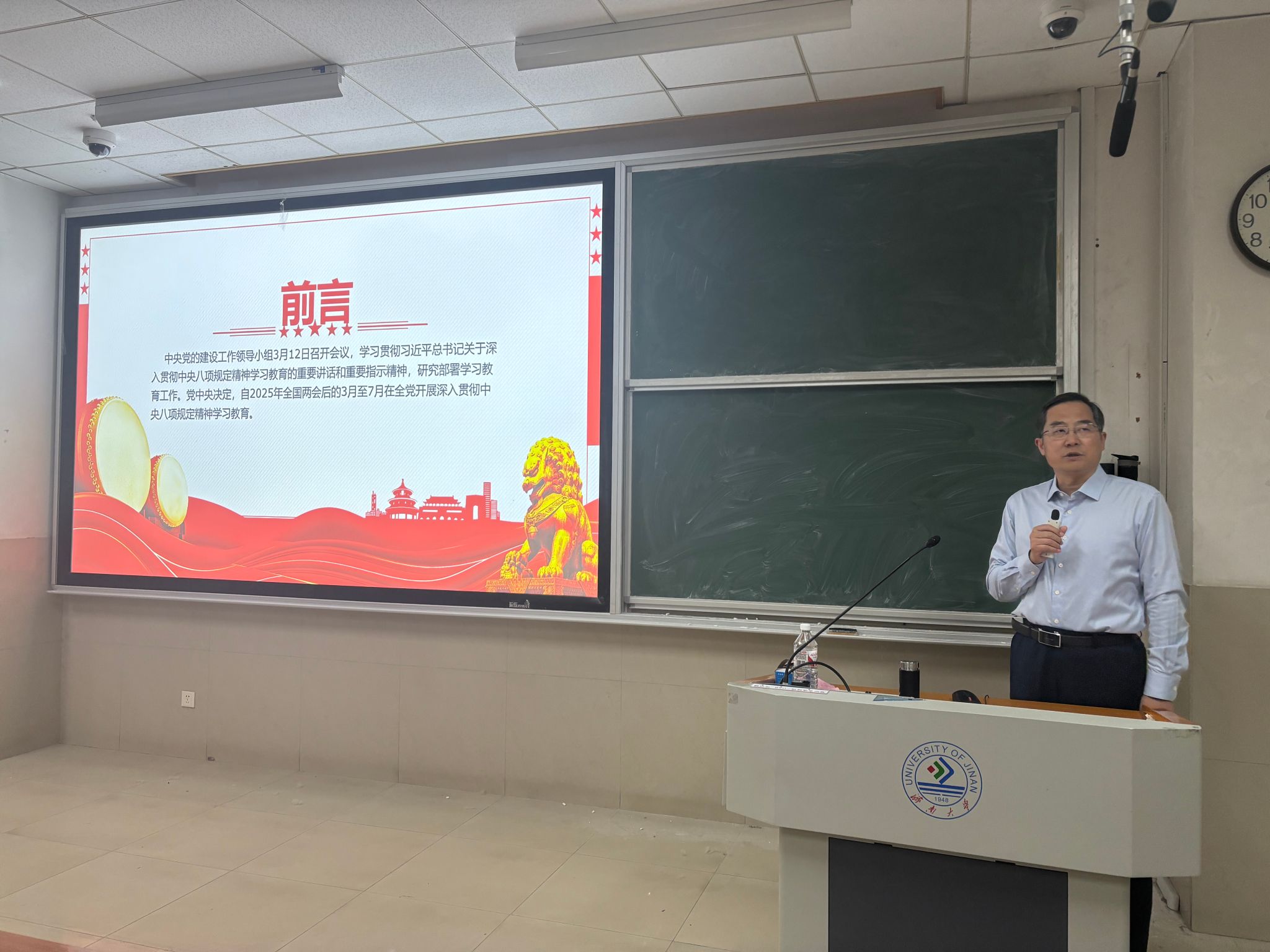 贺铭以《深入贯彻中央八项规定精神学习教育》为主题,解读了中央八项规定精神内涵与青年员工践行路径。他结合党的百年奋斗历程,系统阐释了中央八项规定的制定背景、核心要义及深远意义。立足高校实际和青年特点,结合近年来高校系统违反中央八项规定的典型案例,通过详实的案例和数据,深入剖析“四风”问题的隐形变异表现,并强调青年员工尤其要在科研诚信、学风建设、社会实践、网络言行等方面筑牢底线意识。最后他提出三点希望:一是要明大德、守公德、严私德,以党的纪律为镜鉴,争做崇廉尚洁的“表率者”;二是要勤学善思、知行合一,将八项规定精神贯穿于学术科研、志愿服务和日常生活中,当好优良作风的“传承者”;三是要心怀“国之大者”,用实际行动践行“请党放心,强国有我”的青春誓言,在服务国家重大战略需求中彰显济大化院青年的责任担当。