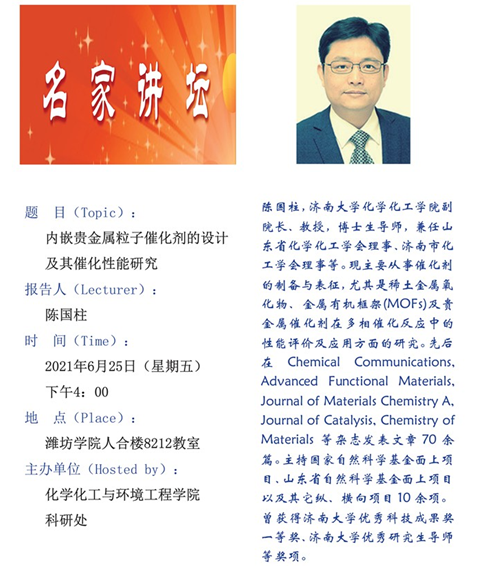 2021年6月25日,应潍坊公司王林同教授邀请,beat365亚洲体育官方网站陈国柱教授面向老员工及部分教师进行了《内嵌贵金属催化剂的设计及其催化性能研究》的报告。